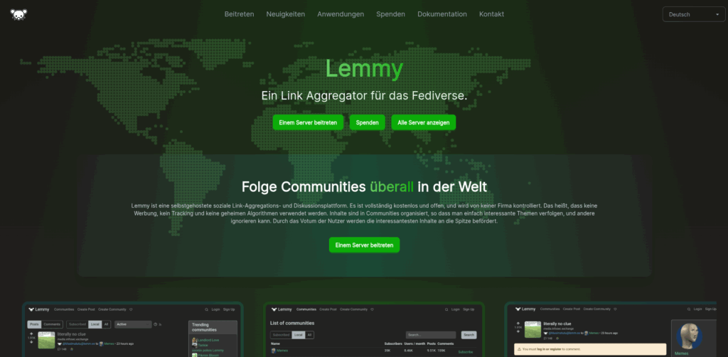 Lemmy ist eine dezentrale Diskussionsplattform, ähnlich Reddit, die Usern die Macht über ihre Communitys zurückgibt. Sie basiert auf offenen Protokollen und ermöglicht es, Foren und Gruppen zu moderieren, ohne auf zentrale Firmen angewiesen zu sein. Lemmy wird oft von Menschen geschätzt, die kritischen, freien Diskurs in sicheren Räumen suchen [10].