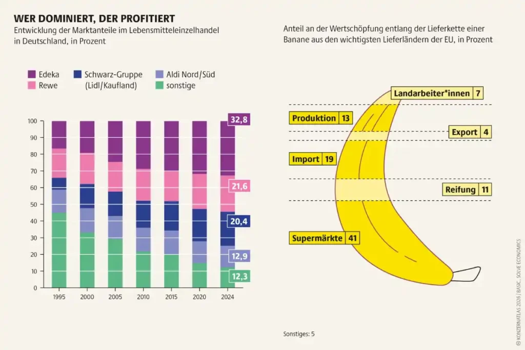 Vier Supermarktketten kontrollieren zum Beispiel 88 % des Lebensmittelhandels. „Sie bestimmen, was produziert wird, welche Produkte in Regalen und Tiefkühltheken landen – und wer daran verdient“, erfährt man im Konzernatlas 2025, aus dem auch die Grafiken in diesem Beitrag stammt. Das verleiht ihnen viel Macht. Zum Beispiel sind die Lebensmittelpreise zwischen 2020 und 2025 laut Konzernatlas um 36,1 % gestiegen – und damit viel stärker als die allgemeine Inflation (23 %).